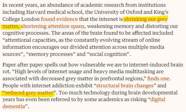 Among many observations and takes (most of which are questionable if you actually look into them, which I did), the ‘smoking gun’ for the claim that smartphones are legitimately harmful for the brain, is several neuroscientific studies which report that individuals with high levels of phone/internet use show “reduced grey matter”.3