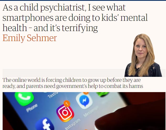 This latest effort is titled “As a child psychiatrist, I see what smartphones are doing to kids’ mental health – and it’s terrifying”, written by Emily Sehmer. Who is, by process of deduction, a child psychiatrist.